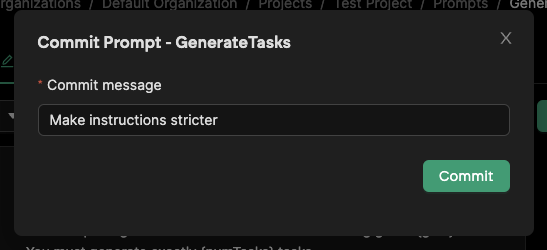 After making changes to a prompt, you can commit a new version by clicking the Commit button in the top right corner of the prompt editor. A pop-up will appear, where you will provide a commit message.