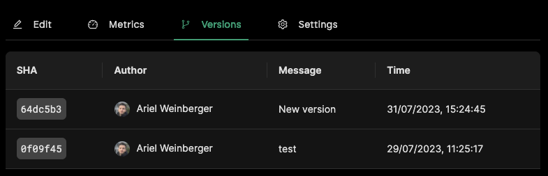 When selecting a prompt, you can navigate to the Versions tab to see a full list of versions for the prompt.