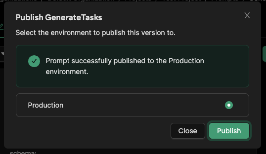 To publish a version, click the Publish button in the top right corner of the prompt editor. A pop-up will appear, where you will select the environment you want to deploy to.
